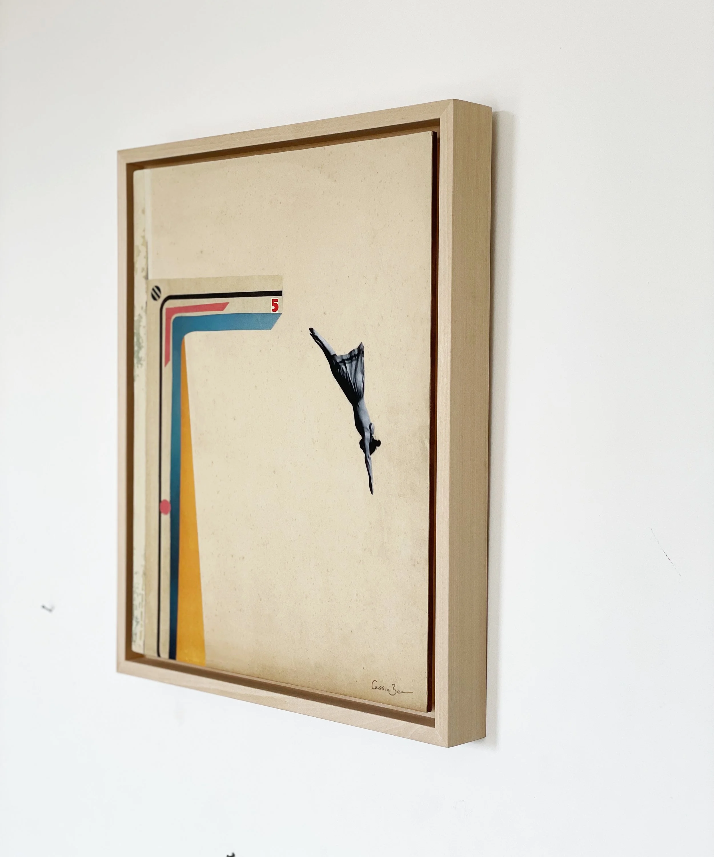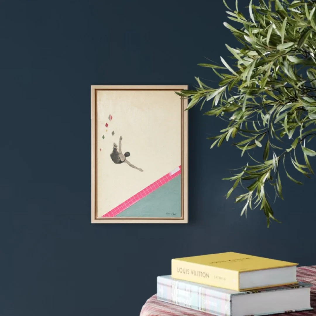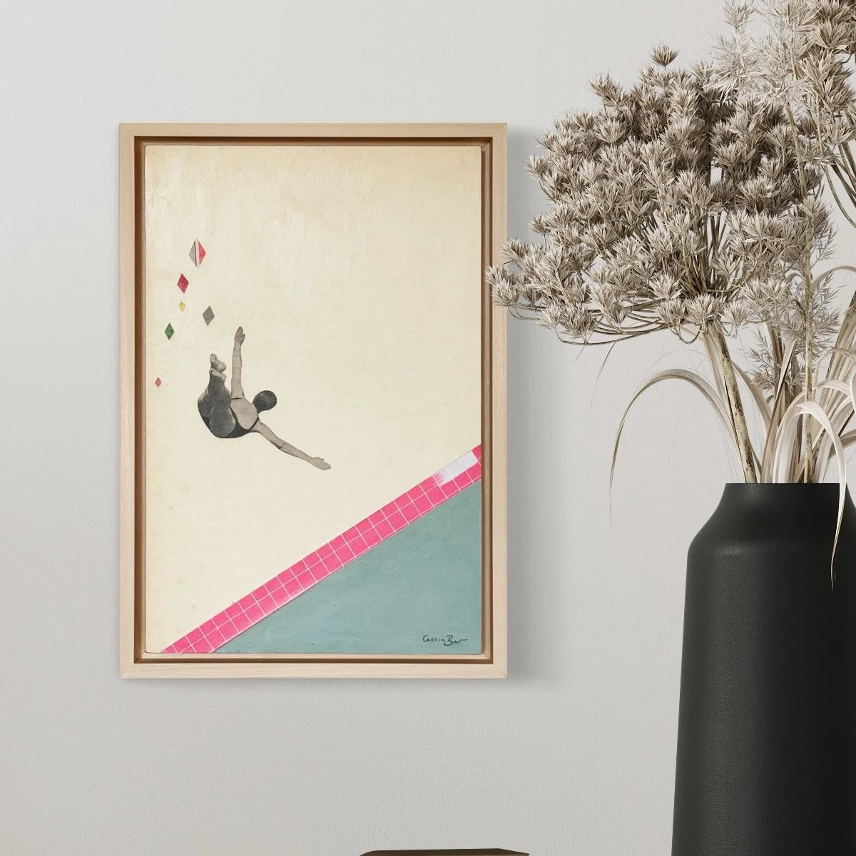 A brightly coloured retro swimming pool artwork in pink, orange and blue on panel. This vibrant diving art will look good in a bedroom, hallway or office.