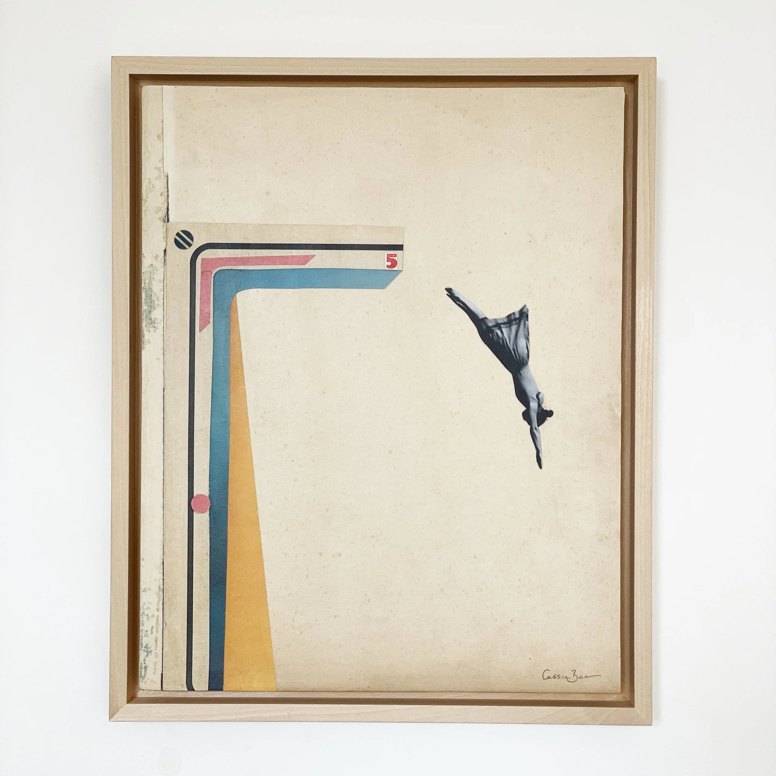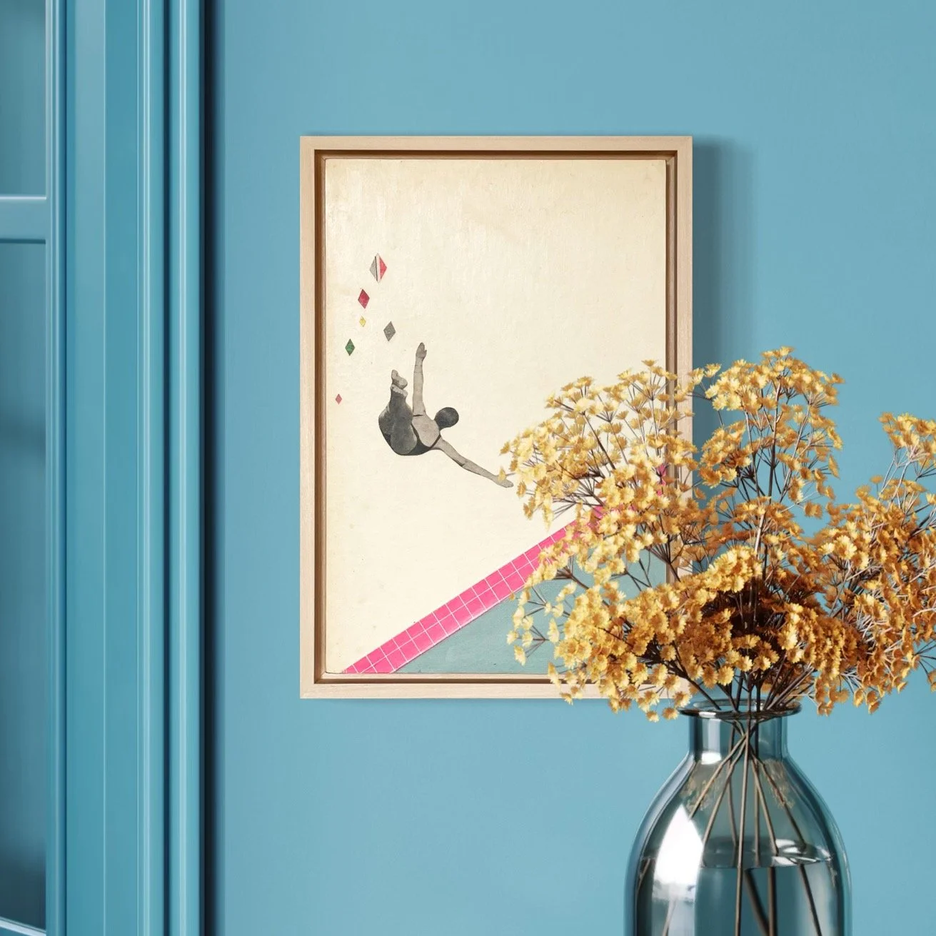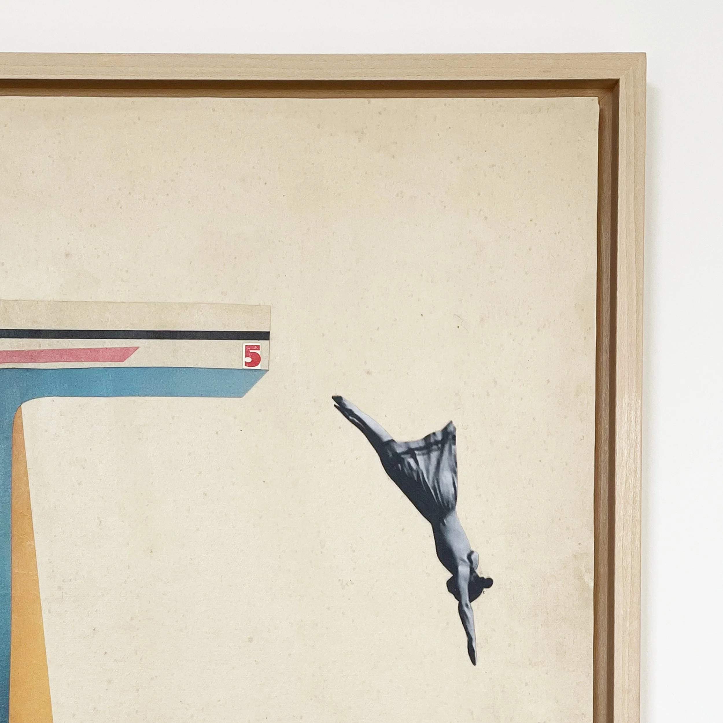 A brightly coloured retro swimming pool artwork in pink, orange and blue on panel. This vibrant diving art will look good in a bedroom, hallway or office.